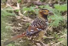 大噪鹛:中型鸟类,体长32-36厘米。额至头顶黑褐色,背栗褐色满杂以白色斑点,斑点前缘或四周还围有黑色。初级覆羽、大覆羽和初级飞羽具白色端斑。尾特长,均具黑色亚端斑和白色端斑。颏、喉棕褐色,…全部>>