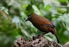 栗颈噪鹛是噪眉科、噪鹛属中型鸟类,体长22-25厘米。头顶至枕暗石板灰色,前额、头侧、颏、喉至上胸黑色,耳后至颈侧有一栗棕色块斑,在头后颈侧极为醒目。上体暗橄榄褐色,两翅黑褐色,初级飞羽外翈沾灰。…全部>>