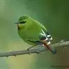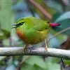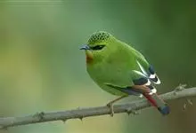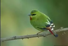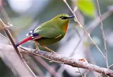 火尾绿鹛是莺科、绿鹛属小型鸟类,体长11-14厘米。上体绿色,头顶至枕具黑色鳞状斑,眼先和眼后黑色,眉纹黄绿色。两翅黑色具黄色和红色翅斑及白色端斑,极为醒目。中央一对尾羽绿色,外侧尾羽鲜红色。…全部>>