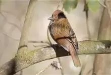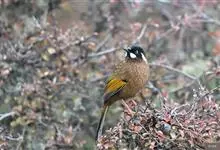 黑顶噪鹛:中型鸟类,体长24-26厘米。前额、脸、颏、喉黑色,头顶黑褐沾棕或深棕橄榄褐色,背栗褐或棕褐色,颧斑白色或棕红色,眼后缘和颈侧亦具白斑,飞羽金黄橄榄色而具蓝灰色尖端。下体淡棕褐色。…全部>>