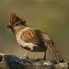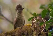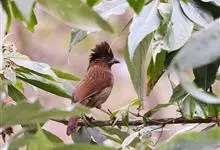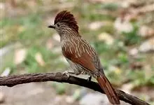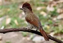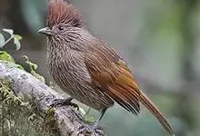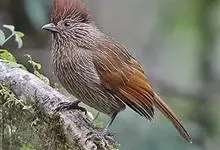 条纹噪鹛是画眉科、噪鹛属中型鸟类,体长28-32厘米。头具短的羽冠,上体栗褐色,飞羽外翻蓝灰色。下体棕栗色,腹以后转为褐白色。除飞羽和尾羽外,所有上、下体羽均具白色羽干纹。极为醒目。野外特征明显,…全部>>