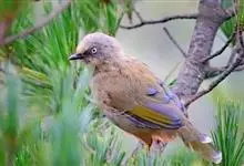 橙翅噪鹛:是噪鹛科、彩翼噪鹛属的中型鸟类,体长22-25厘米。头顶深葡萄灰色或沙褐色。上体灰橄榄褐色,外侧飞羽外翈蓝灰色、基部橙黄色,中央尾羽灰褐色,外侧尾羽外翈绿色而缘以橙黄色并具白色端斑。…全部>>
