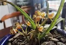 大花盆距兰 Kuntze):茎粗壮,长2-5厘米,节间长约1厘米。叶大,带状或长圆形。伞形花序侧生,通常2-3个,具4-6朵花;花大;萼片和花瓣淡黄色带棕紫色斑点,椭圆形,近相似,长12-17毫米,…全部>>