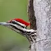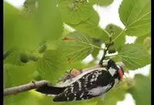绒啄木鸟,北美洲最小的啄木鸟,白腹黑背和黑项,黑翼上有白色斑点。头部有黑白相间的条纹,尾巴短小,雄鸟的头部有红色羽毛。绒啄木鸟原是阿拉斯加的居民,现分布加拿大和南部遍及美国的西南。 首选的栖所包括森…全部>>