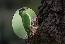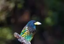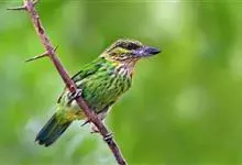 绿拟啄木鸟为鴷形目,须科,拟啄木属的一种。形较大拟啄木鸟略小,体长约260mm。头、颈及胸浅褐而具淡黄白色条纹;喉几为淡黄白色;身体余部草绿色。虹膜棕褐色,眼周裸露部黄色;嘴峰角黄色;跗跖和趾角黄…全部>>