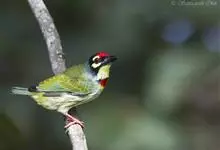 金喉拟啄木鸟,是须鴷科、拟啄木鸟属的鸟类。金喉拟啄木鸟为小型鸟类,体长19-24厘米。额深红色,头顶金黄色,后枕具一大块深红色斑,耳羽和头侧银灰色,上体草绿色,颏和上喉金黄色,下喉淡银灰色,…全部>>