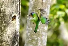 绿拟啄木鸟为鴷形目,须科,拟啄木属的一种。形较大拟啄木鸟略小,体长约260mm。头、颈及胸浅褐而具淡黄白色条纹;喉几为淡黄白色;身体余部草绿色。虹膜棕褐色,眼周裸露部黄色;嘴峰角黄色;跗跖和趾角黄…全部>>