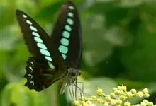青带凤蝶Graphium sarpedon ,又名青凤蝶,是最普遍的中型凤蝶,飞行速度很快。青带凤蝶的翅膀中央有许多浅蓝色的斑点,很整齐地排列成一条直线。这些斑点由上而下逐渐变大,就像一条青色的带子。全部>>