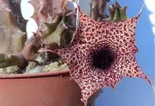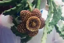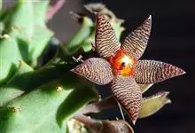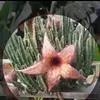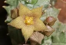 巨花犀角又称大豹皮花,是夹竹桃科犀角属的一种植物。茎粗,花大,边缘生长细毛。植株柱形多分枝呈丛生,柱形具4棱,棱缘具细小疣突。花大,五角星形黄色,并有横向棕褐色斑纹,似豹皮而得名。花期夏秋两季。…全部>>
