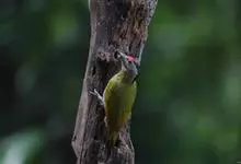 绿啄木鸟是鴷形目啄木鸟科绿啄木鸟属鸟类。雄鸟额和头顶前部辉红色,鲜丽异常;雌鸟头上无红色;嘴尖直,尖锐如凿;舌细长而能伸缩,先端列生短钩;嘴基部至眼有一黑色条纹;头的余部灰色,颜面、喉部和前颈较浅,…全部>>