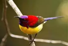 绿喉太阳鸟:共有9个亚种。小型鸟类,雄鸟体长13-15厘米、雌鸟10-12厘米。雄鸟前额至后颈、颏和喉辉绿色,头侧黑色,颈侧和背暗红色,两肩、下背橄榄绿色,腰鲜黄色,尾上覆羽和中央尾羽暗绿色,…全部>>