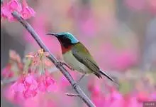叉尾太阳鸟,雀形目太阳鸟科太阳鸟属留鸟;为小型鸟类,雄鸟头顶辉蓝绿色,上体橄榄绿色,腰明黄色,中央尾羽亮翠蓝色,羽轴针状延长,外侧尾羽黑色具白色端斑,头侧黑色,颜、喉和胸为绛红色,…全部>>