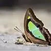 大二尾蛱蝶两翅正面黑色,中域有一浅绿色大型宽带纹,两翅反面浅绿色,中域有一缀黑边的褐色弧纹,亚外缘还有一深褐色横纹,后翅各有尾突两条,…全部>>