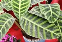 绒叶肖竹芋 Lindl.)是竹芋科,肖竹芋属多年生中等大草本植物,株高可达1米。叶片长圆状披针形,不等侧,叶面深绿,有黄绿色的条纹,天鹅绒般,叶背幼时浅灰绿色,老时淡紫红色,头状花序,花冠紫堇色或白色,…全部>>