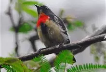 朱背啄花鸟:体重6-8克,体长81-97毫米。是一种小型的黑色及红色啄花鸟。雄鸟顶冠、背及腰猩红色,两翼、头侧及尾黑,两胁灰,下体余部白色。雌鸟上体橄榄色,腰及尾上覆羽猩红,尾黑。亚成鸟清灰色,嘴橘黄,…全部>>