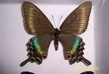 巴黎翠凤蝶中型凤蝶,躯体黑褐色,散布绿色亮鳞。后翅M3脉端有一明显叶状尾突。翅背面底色黑褐色,密布亮鳞,后翅前侧有一枚蓝绿色亮斑,与后翅中央之绿色亮线连接。后翅臀区有一紫红色圈纹。翅腹面底色褐色,于…全部>>