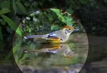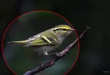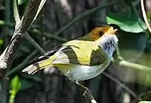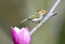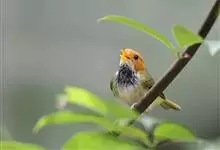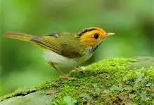 黑脸鹟莺:体长10厘米,是有特色的体小而多彩的莺鸟。粗眉纹,颏、喉及尾下覆羽黄色,脸罩黑,头顶及颈背灰色,上体绿,无翼纹,腹白。虹膜褐色;上嘴色深,下嘴肉色;脚偏绿色。…全部>>