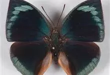 巴黎翠凤蝶中型凤蝶,躯体黑褐色,散布绿色亮鳞。后翅M3脉端有一明显叶状尾突。翅背面底色黑褐色,密布亮鳞,后翅前侧有一枚蓝绿色亮斑,与后翅中央之绿色亮线连接。后翅臀区有一紫红色圈纹。翅腹面底色褐色,于…全部>>