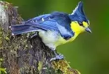 台湾黄山雀体长约13厘米。头顶至后颈黑色,有一长的黑色羽冠,羽冠末端和后颈中央白色。背苍绿色,两翅和尾黑色,羽缘蓝灰色,外侧尾羽白色。额基和下体鲜黄色,尾下覆羽白色,雄鸟腹部有一黑斑。…全部>>