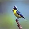 台湾黄山雀体长约13厘米。头顶至后颈黑色,有一长的黑色羽冠,羽冠末端和后颈中央白色。背苍绿色,两翅和尾黑色,羽缘蓝灰色,外侧尾羽白色。额基和下体鲜黄色,尾下覆羽白色,雄鸟腹部有一黑斑。…全部>>