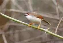 金眼鹛雀是莺科、鹛雀属小型鸟类。体长16-20厘米。头顶和上体棕褐色,两翅表面肉桂红色,尾褐色具明暗相间横斑。眼周金黄色,眼先、眼上、眼下、颊以及颏、喉和上胸概为白色,其余下体茶黄色,脚橙黄色。…全部>>