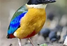 蓝八色鸫是雀形目八色鸫科的鸟类,体长约24厘米,体重109克左右。体型圆胖,尾短,腿长。羽色鲜艳,头顶两侧橘黄色的宽带延伸至颈背,宽宽的过眼纹黑色,脸颊皮黄,髭纹黑,尾亮蓝色。雌鸟较雄鸟色暗,…全部>>