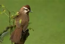 白颊噪鹛是雀形目噪鹛科噪鹛属鸟类,又称土画眉、小画眉、小噪鹃。成鸟额至头顶栗褐色,长眉纹、眼先和颊纹棕白色,眼后至耳羽深褐色,…全部>>