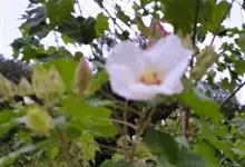 木芙蓉,锦葵科木槿属落叶灌木或小乔木。小枝上有细绒毛;叶片为卵状心形,托叶为披针形,常早落;花单生,花萼为钟形,花冠初为白色或淡红色,后逐渐变为深红色;果实为扁球形,有淡黄色的毛附着。花期8到10月。…全部>>