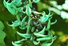 翡翠葛是豆科翡翠葛属植物,多年生常绿大型藤本,茎木质,直径可达30厘米,长可达21.3米。三出复叶,革质光亮,小叶长椭圆形,长7.6-12.7厘米,中间小叶最长。花两性,春季至初夏开花,蓝绿色,…全部>>