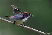 普通缝叶莺,是雀形目鹅科莺亚科缝叶莺属一种。体长10-14厘米,体重7-10克,雄鸟前额棕红,头顶至枕棕橄榄褐,上体橄榄绿染黄,飞羽及尾羽暗褐;繁殖期雄鸟的中央尾羽特形延长,下体淡皮黄白色。…全部>>