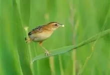 金头扇尾莺体小而具褐色纵纹的莺。嘴细长,略向下弯;翼短,体型娇小,尾长。下体皮黄,喉近白,尾深褐,尾端皮黄。雌雄羽色相近,羽色单调。繁殖期雄鸟顶冠亮金色,腰褐色。雌鸟及非繁殖期雄鸟头顶密布黑色细纹,…全部>>