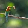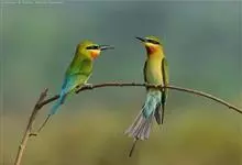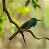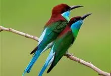 蓝喉蜂是蜂虎科蜂虎属鸟类。体长26-28厘米,嘴长而弯曲,有明显细长的中央尾羽。头部、颈部和背部为巧克力色,有黑色眼纹。喉部、腰部和尾羽为蓝色。腹部和两翼为绿色。幼鸟外观似成鸟,头部、颈部和背部为绿色,…全部>>