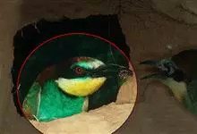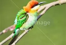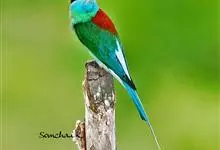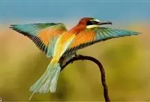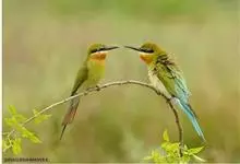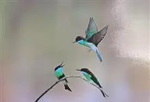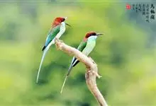 栗喉蜂虎是蜂虎科蜂虎属的鸟类。有热带鸟类羽毛艳丽的特征:喉部是栗红色的,黑色的过眼纹,翅膀和背部是绿色的,尾翼是蓝色的,飞行时翅膀下面的羽毛是橙黄色的,在阳光的照射下,它们全身闪烁着金属般的艳丽光泽,…全部>>