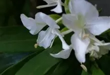 姜花又名野姜花。是姜科姜花属的多年生草本植物,茎高1-2米;叶片长圆状披针形或披针形,叶面光滑,叶背被短柔毛;穗状花序顶生,椭圆形,花芬芳,白色;蒴果卵状三棱形,微黄绿色;种子鲜红色,具橘红色的假种皮。…全部>>