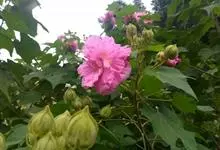木芙蓉,锦葵科木槿属落叶灌木或小乔木。小枝上有细绒毛;叶片为卵状心形,托叶为披针形,常早落;花单生,花萼为钟形,花冠初为白色或淡红色,后逐渐变为深红色;果实为扁球形,有淡黄色的毛附着。花期8到10月。…全部>>