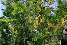腊肠树:是豆科腊肠树属植物。落叶乔木,高可达15米;枝细长;树皮灰色,老时粗糙,暗褐色。叶长30-40厘米,小叶对生,薄革质,阔卵形,卵形或长圆形,边全缘,幼嫩时两面被微柔毛,老时无毛;叶脉纤细,…全部>>