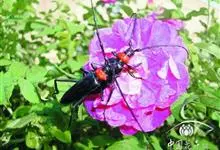 桃红颈天牛是天牛科、颈天牛属昆虫。体黑色发亮,前胸背面大部分为光亮的棕红色或完全黑色。头黑色,腹面有许多横皱,头顶部两眼间有深凹。触角蓝紫色,前胸背面前后缘呈黑色并收缩下陷密布横皱。鞘翅表面光滑。…全部>>