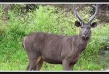 水鹿是偶蹄目鹿科鹿属哺乳动物,又称黑鹿、春鹿、山牛。身体高大粗壮。头骨细长,鼻骨、额骨发达,颈部较长;四肢细长,主蹄大,侧蹄小;长尾巴的两侧密生着长毛。雄性头上有角,角从额部的后外侧生出,稍向外倾斜,…全部>>