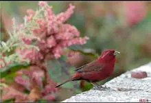 藏朱雀:全长约17-18厘米。雄鸟头部深红色具光辉,喉部暗红色具白色点斑;背部灰白色,各羽具玫瑰红色羽端,形成许多斑纹;腰部淡玫瑰红色;翅暗褐色,沾灰白,羽端沾玫瑰红或灰白色;尾暗棕色,端缘玫瑰红色…全部>>