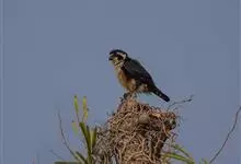 红腿小隼是隼形目隼科小隼属鸟类。红腿小隼前额白色,眼上有一宽阔的白色眉纹,往后经耳覆羽与上背白色领圈相连颊和耳覆羽白色,从眼前开始有一粗的黑色贯眼纹经眼斜向下到耳;其余上体包括翅和尾黑色,…全部>>