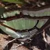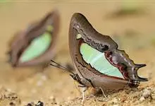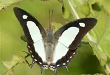 大二尾蛱蝶两翅正面黑色,中域有一浅绿色大型宽带纹,两翅反面浅绿色,中域有一缀黑边的褐色弧纹,亚外缘还有一深褐色横纹,后翅各有尾突两条,…全部>>