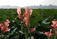 粉美人蕉:是一种球根草本植物。根茎延长,株高1.5-2米;茎绿色。叶片披针形;总状花序疏花,单生或分叉,稍高出叶上;苞片圆形,褐色,花黄色,无斑点;有多种园艺栽培品种,颜色从粉、橙红色及具带红色斑点…全部>>
