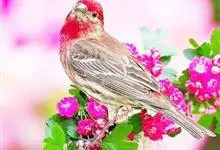 普通朱雀是雀形目雀科朱雀属鸟类,又名红朱雀、马料、青麻料。雄鸟上体红色,下体淡红色;头部、喉部、胸部及腰部亮红色;背部褐色染红色;两翼及尾黑褐色,羽缘染红色。雌鸟上体橄榄褐色,下体近白色,…全部>>