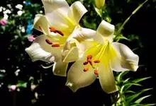麝香百合:在中国台湾亦称铁炮百合。鳞茎球形或近球形,高2.5-5厘米;鳞片白色。茎高45-90厘米,绿色,基部为淡红色。叶散生,披针形或矩圆状披针形,两面无毛。花单生或2-3朵;花喇叭形,白色,筒外…全部>>