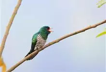 紫金鹃是一种羽色艳丽的小形杜鹃,体长约17厘米。雄鸟头、颈、胸和上体辉紫色,腹白色,具紫蓝色横斑;雌鸟上体淡铜绿色,下体白色,具淡褐色横斑。而相似种翠金鹃雄鸟上体和胸辉绿色,…全部>>