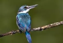 白领翡翠:有50个亚种。体长18厘米,体重35-40克。是一种蓝白色翡翠鸟。头顶、两翼、背及尾呈亮丽蓝绿色;过眼纹黑色;眼先黑色,眼眉白色或浅黄色,嘴上部具白点。以白色的颈环及下体为识别特征。…全部>>