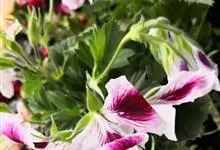 蔓性天竺葵学名盾叶天竺葵 Ait.)是牻牛儿苗科天竺葵属植物。多年生攀缘或缠绕草本,长40-100厘米,茎具棱角,多分枝,叶互生,略呈肉质,伞房花序腋生,有花数朵,花冠洋红色,上面2瓣着深色条纹,…全部>>