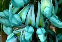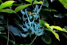 翡翠葛是豆科翡翠葛属植物,多年生常绿大型藤本,茎木质,直径可达30厘米,长可达21.3米。三出复叶,革质光亮,小叶长椭圆形,长7.6-12.7厘米,中间小叶最长。花两性,春季至初夏开花,蓝绿色,…全部>>