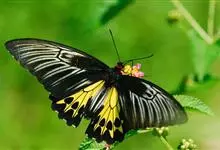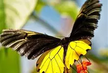 金裳凤蝶是凤蝶科、裳凤蝶属的动物。金裳凤蝶身体呈黑色,头、颈和胸侧有红毛,腹部有黑黄两色相间条纹,雄蝶前翅黑色,具黑天鹅绒光泽,各脉两侧灰白色,后翅金黄色,各室外缘有等腰三角形黑斑1枚,斑内侧有晕,…全部>>