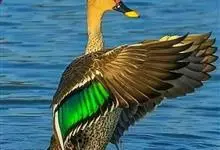 绿翅鸭是小型鸭类,体长37厘米,体重约0.5千克。嘴脚均为黑色。雄鸟头至颈部深栗色,头顶两侧从眼开始有一条宽阔的绿色带斑一直延伸至颈侧,尾下覆羽黑色,两侧各有一黄色三角形斑,在水中游泳时,极为醒目。…全部>>